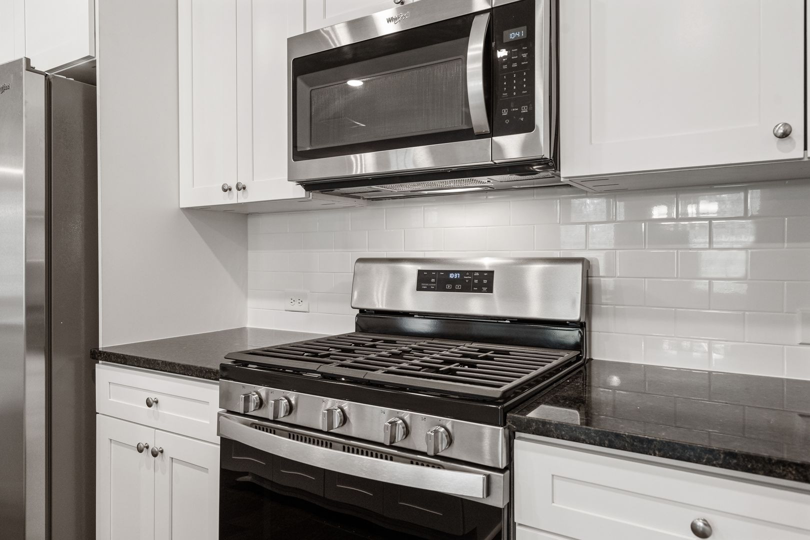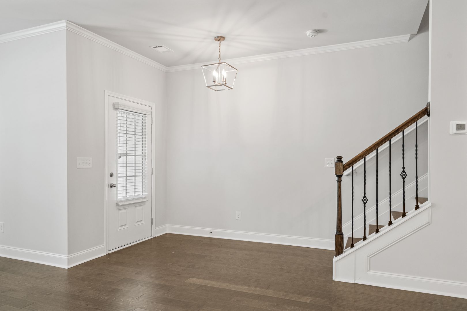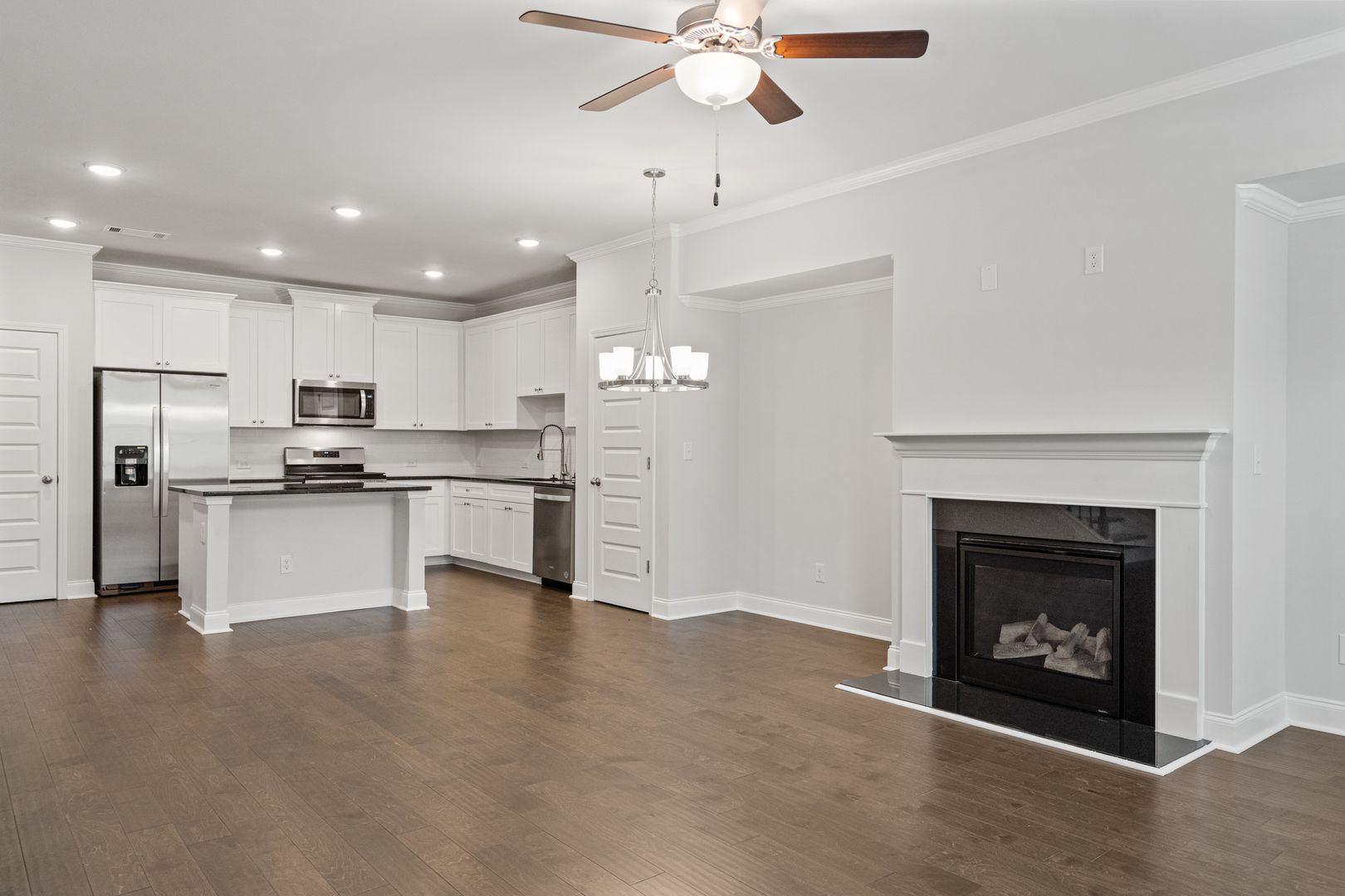 This beautiful townhome features an open floor plan with high ceilings and hardwood flooring throughout the main living areas. The kitchen includes designer wood cabinetry with crown molding, granite countertops, stainless steel appliances, tile backsplash, and a spacious walk-in pantry. A bedroom on the main level adds extra convenience.